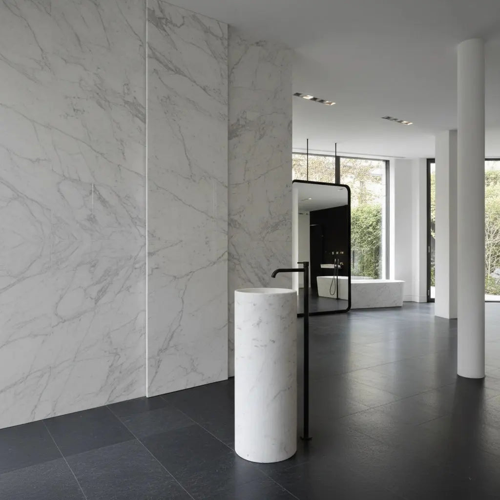 Le marbre de Carrare Gioia permet de concevoir un espace cohérent, lumineux et haut de gamme.